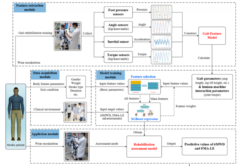 該論文提出一種新穎的基于下肢外骨骼機器人對中風患者進行智能康復評估的方法。其工作框架包括:數據采集模塊 – 收集并預處理患者的身體特征參數、患病狀況和運動生物力學參數;特征提取模塊 – 根據外骨骼機器人傳感器數據,構造步態特征模型推導患者步態參數;模型訓練模塊 – 基于患者特征參數、步態參數及人機交互參數,利用XGBoost機器學習算法訓練康復評估模型;應用模塊 – 評估模式下,康復評估模型可以預測新的中風患者6MWD和FMA-LE值。