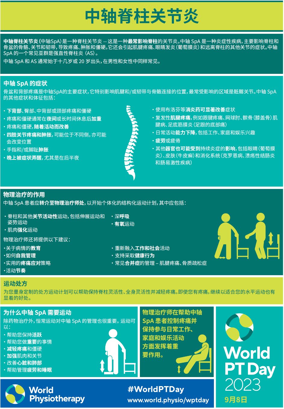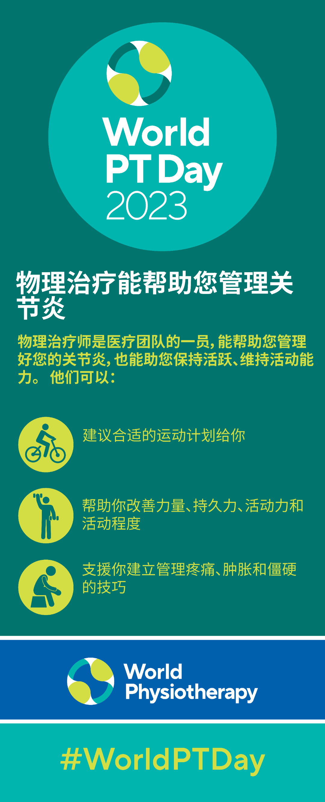 今年世界物理治療師日的主題依舊是關(guān)節(jié)炎,讓我們繼續(xù)聚焦于這個(gè)世界性的問(wèn)題,深入了解炎癥性關(guān)節(jié)炎,包括類(lèi)風(fēng)濕性關(guān)節(jié)炎、中軸性脊柱炎、幼年特發(fā)性關(guān)節(jié)炎等,以及物理治療師在治療和管理受關(guān)節(jié)炎影響人群中的作用。